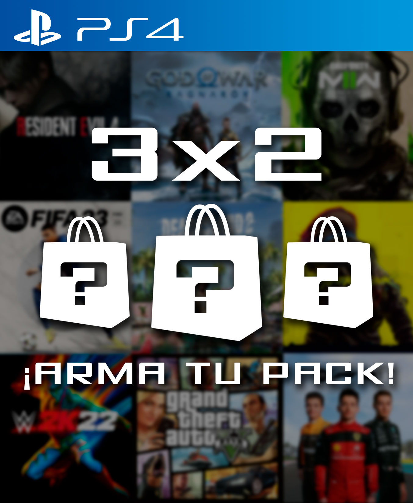 Al realizar la compra podrás escoger 3 juegos de PS4 individual en cuenta secundaria de nuestro catálogo sin importar precio de diferencia que tengan entre ellos.